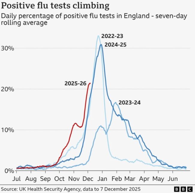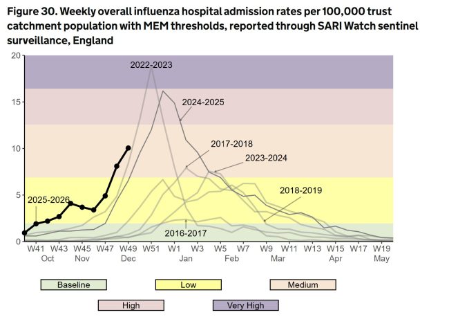 A BBC magyarázata Az influenza öt grafikonban – miben különbözik az idei téli járvány még szakértőket is idéz, akik rámutatnak erre, és megjegyzik, hogy az NHS nem áll a összeomlás szélén [kiemelés tőlem]: