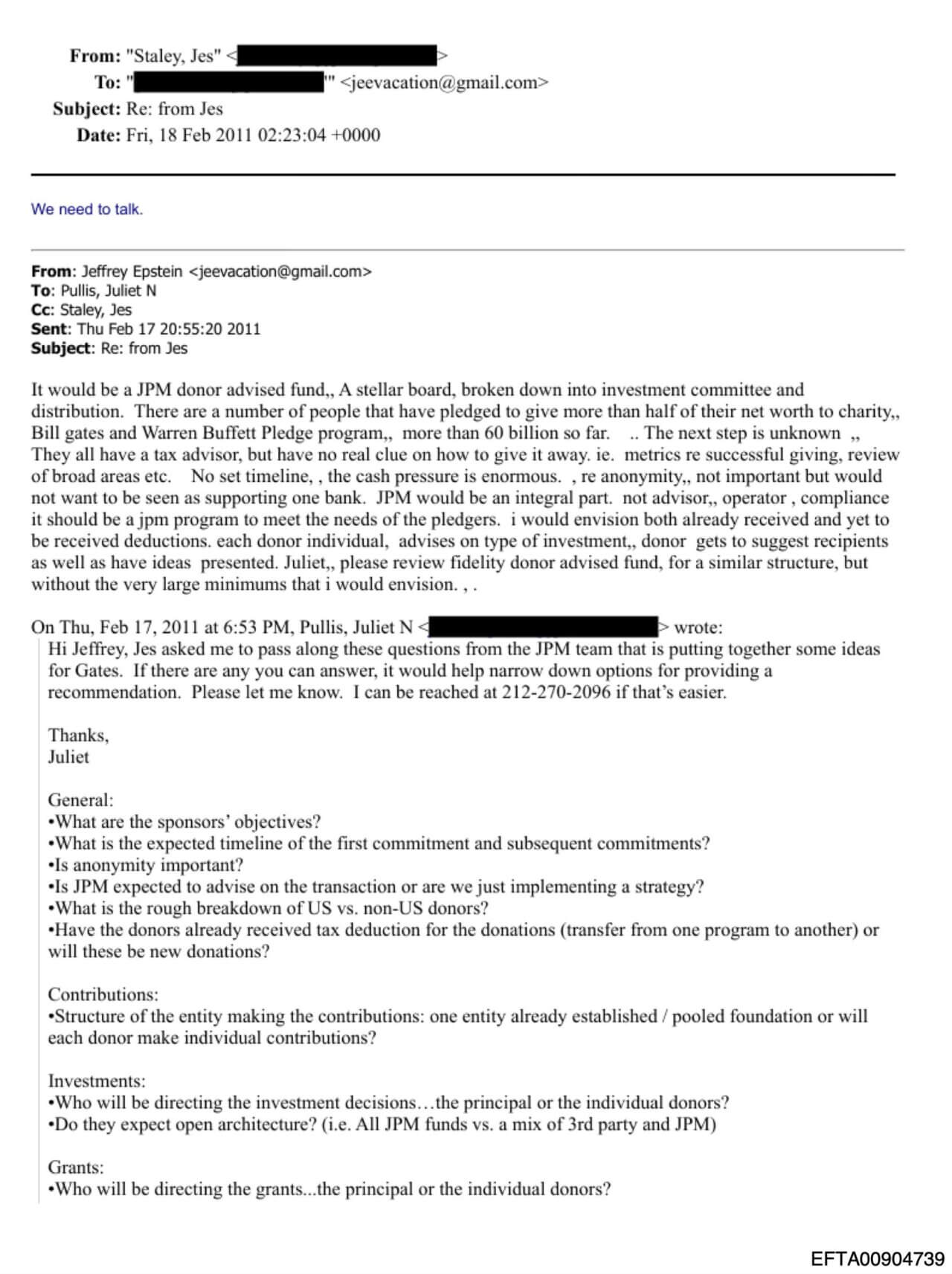 2011. február 17-én Juliet Pullis, a JPMorgan egyik vezetője, aki Jes Staley alatt dolgozott, e-mailt írt Jeffrey Epsteinnek, amelyben egy strukturált kérdéslista szerepelt. Elmondta, hogy Staley kérte meg, hogy továbbítsa ezt. A kérdések a „JPM csapattól származnak, amely néhány ötletet állít össze Gates számára”.