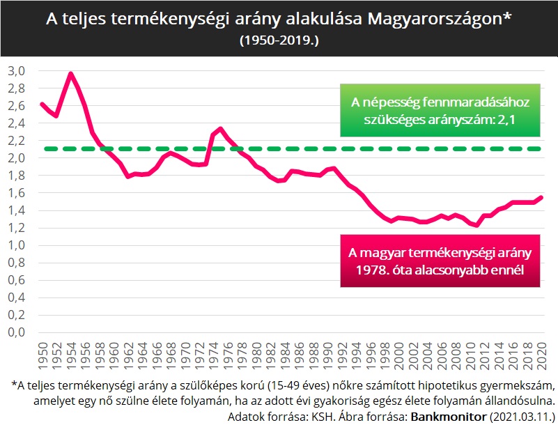 Ahogy ábráink mutatják, a népesség fenntartásához szükséges 2,1 arányt egy szülőképes nőre vetítve utoljára az 1970-es években érte el Magyarország.