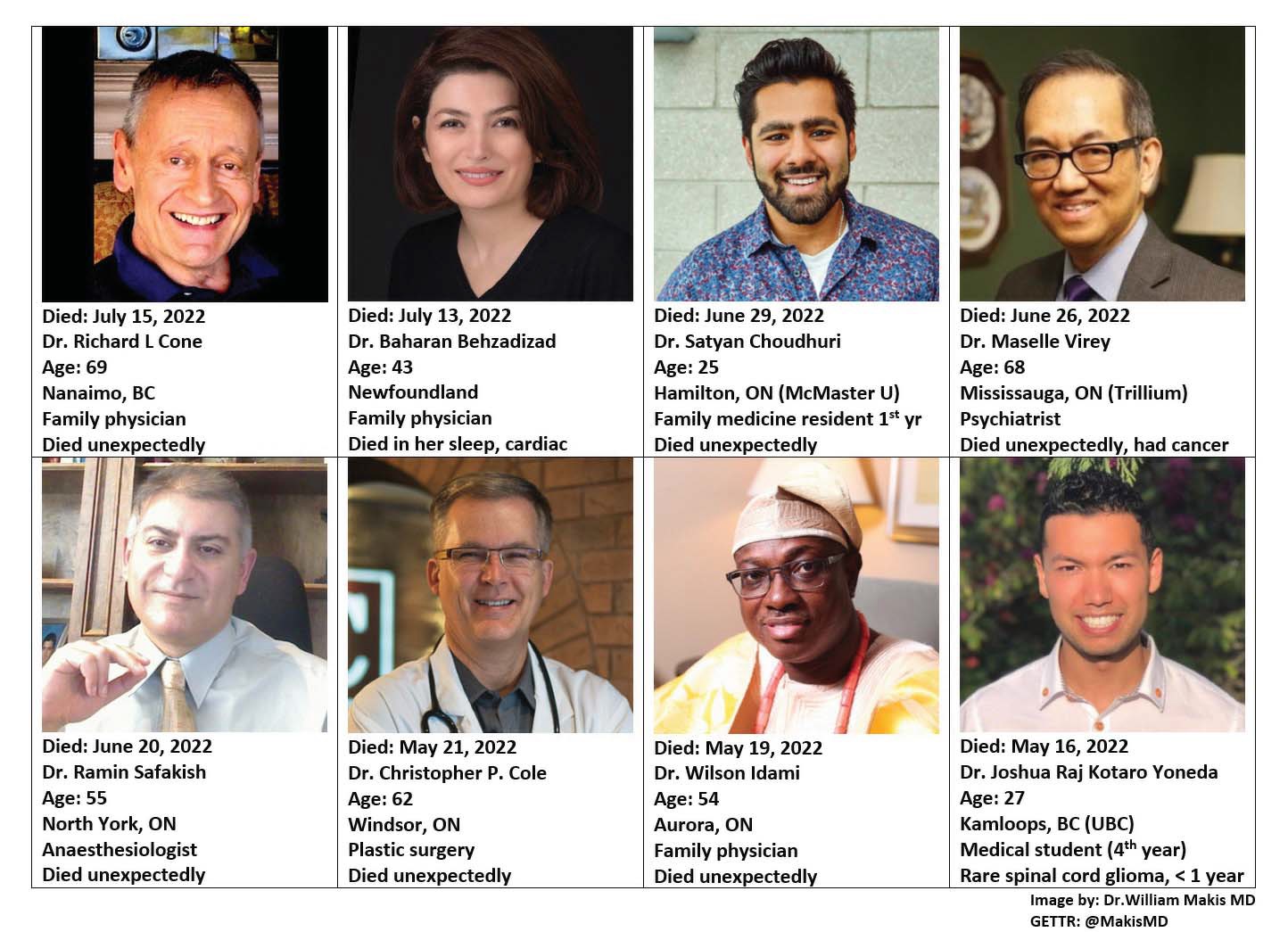 E sorok írója be akart számolni 32 kanadai orvos haláláról. A 32 orvosban a közös, hogy mindannyian beolttatták magukat, ki kétszer, ki háromszor, ki négyszer. Írásunkat Dr. William Makis, az Albertai Egyetem, Radiológiai Tanszéke orvosának levele váltotta volna ki, aki 2022. szeptember 3-án kelt levelében felhívta a Kanadai Orvosi Kamara figyelmét a 32 orvos halálára. A levélre a kamara nem reagált.